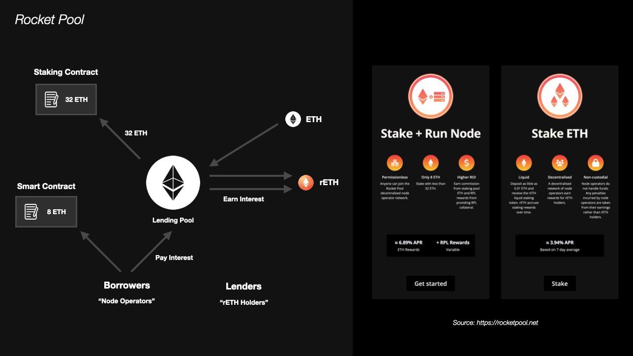 RocketPool is a decentralized Ethereum staking pool founded in 2016. RocketPool pairs people with less than 32 ETH with node operators who stake on their behalf.