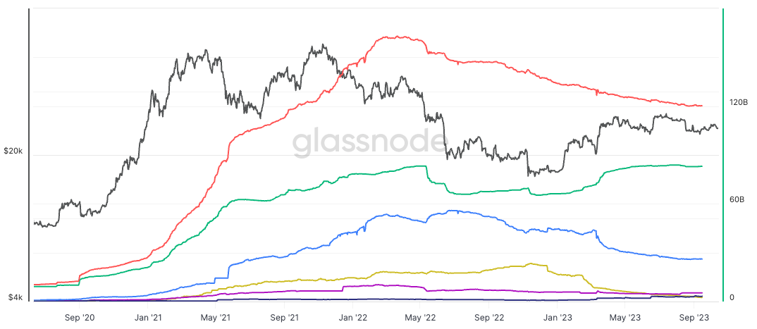The biggest indicator of the effect of rising interest rates is the total market capitalization for stablecoins, which has dropped by almost $40 billion since April 2022. Only USDT has been able to escape any dramatic downward supply decrease, with its circulation at $83 bn, the same level it was before the collapse at Luna. Tether benefited at the cost of every other major stablecoin; BUSD was shut down by the Feds, USDC supply is down by 53%, DAI -60%, and Frax -80%. It's carnage all around.
