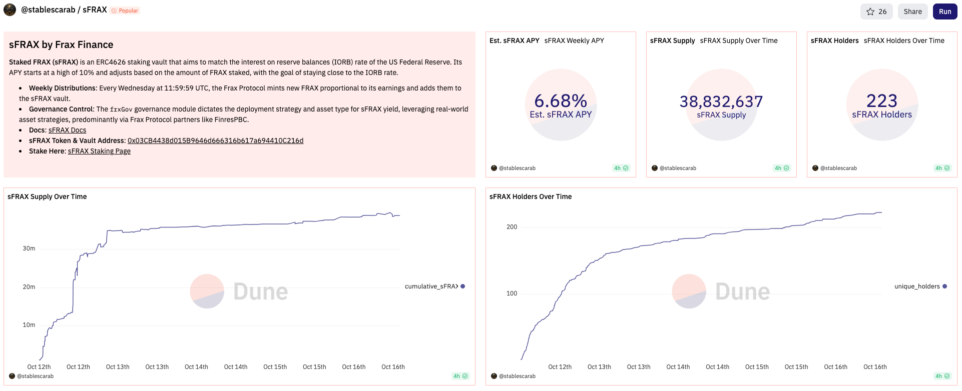 Since its launch, sFRAX has absorbed 40m FRAX, with yields starting at the capped maximum of 10% and declining towards the Federal Reserves IORB rate at full capacity.