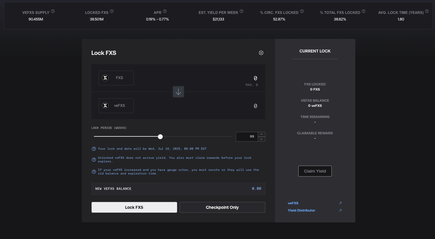 Lock your FXS tokens in Frax Finance's veFXS for up to 4 years, and get up to four times the veFXS, which tapers as the lock ends. While you can't trade veFXS, it boosts your yield, grants governance voting power, and provides cash flow from Frax operations. It's built for committed participants and is central to Frax Finance's growth.
