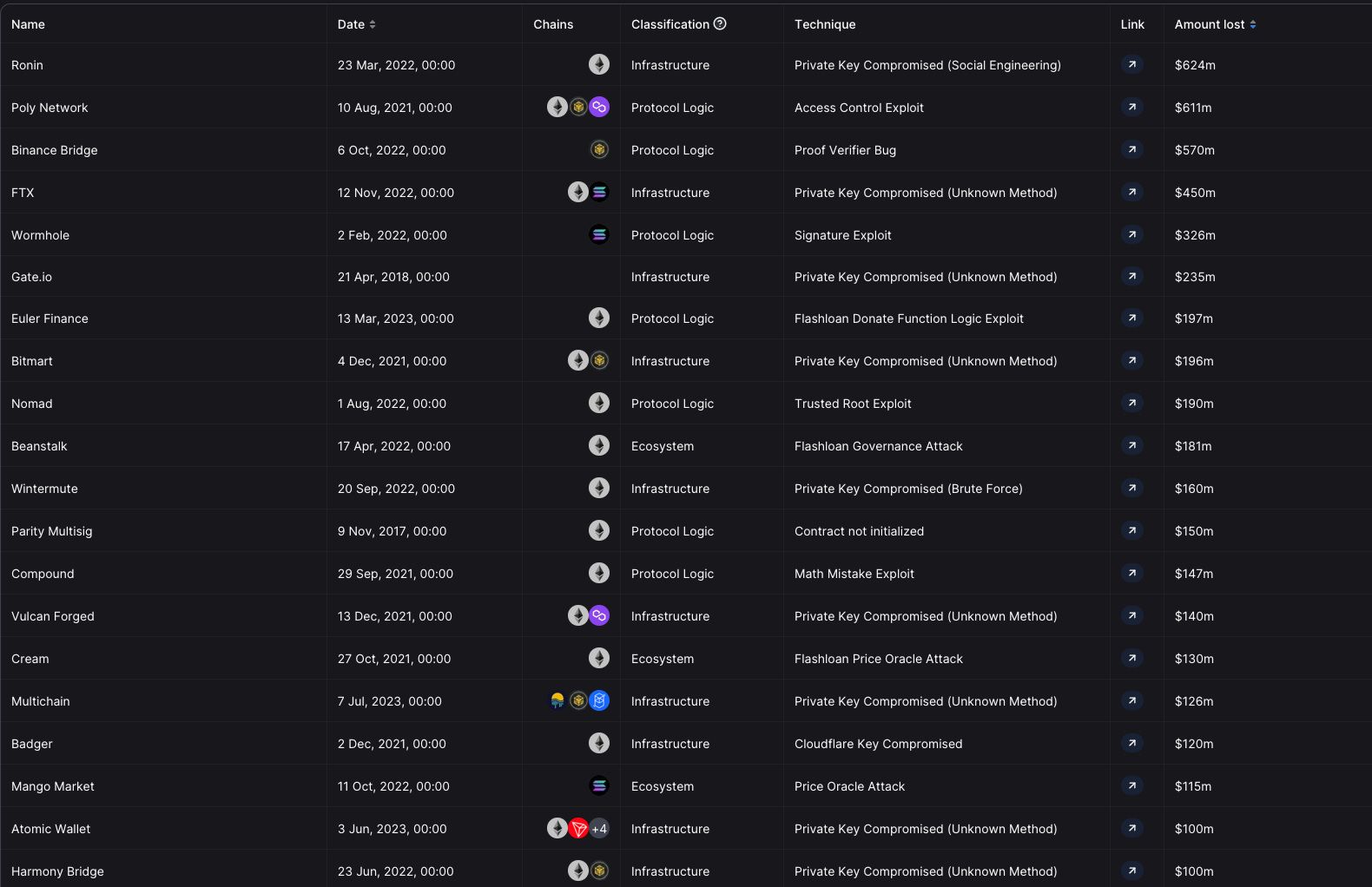A list of all major hacks and exploits in crypto by size of funds stolen. Source: DeFiLlama