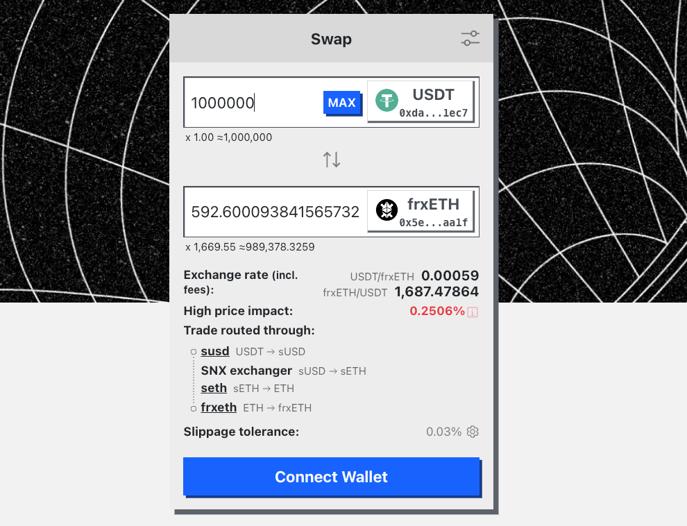 Since there is no USDT/frxETH LP, the order is routed through several LPs to get the best execution USDT > sUSD > sETH > ETH > frxETH. All within one transaction.