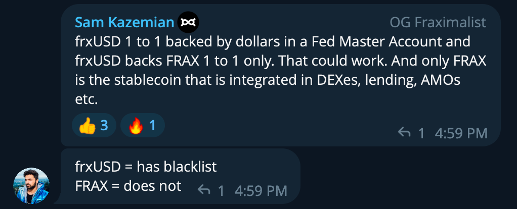 Yet it remains that Frax is a protocol that is governed by a DAO and Sam has declared in the past that the one commandment of Frax is that it exists 100% on-chain. In order for Frax to violate its on-chain roots, it must look towards other ways to access the yield. One route it can take is to partner with a bank that already has a master account or set up a special organization whose sole purpose is to issue a payment stablecoin that is under the TRUST Act’s guidelines. This entity could issue FrxUSD which is 1-1 backed by master account deposits (and rebases a la its yield) and abides by all standard regulations. FrxUSD can then back FRAX which is integrated into DeFi, greatly reducing the protocol’s reliance on USDC.