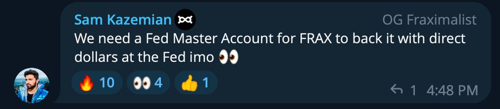 One of the pioneers in the stablecoin landscape who has expressed increased interest in master accounts is Frax Co-Founder Sam Kazemian. In fact last month, Sam Kaz came on Flywheel to share his thoughts on the subject which had been a topic of discussion in Frax’s telegram group at the time. His rationale is that in order for Frax to become the “central bank of DeFi”, it must emulate central banks of the real world such as the Federal Reserve. Sam views almost all types of RWAs as too risky and not in alignment with Frax’s goals as a protocol, and the only RWA worth pursuing is exposure to the risk-free rate of the Federal Reserve.