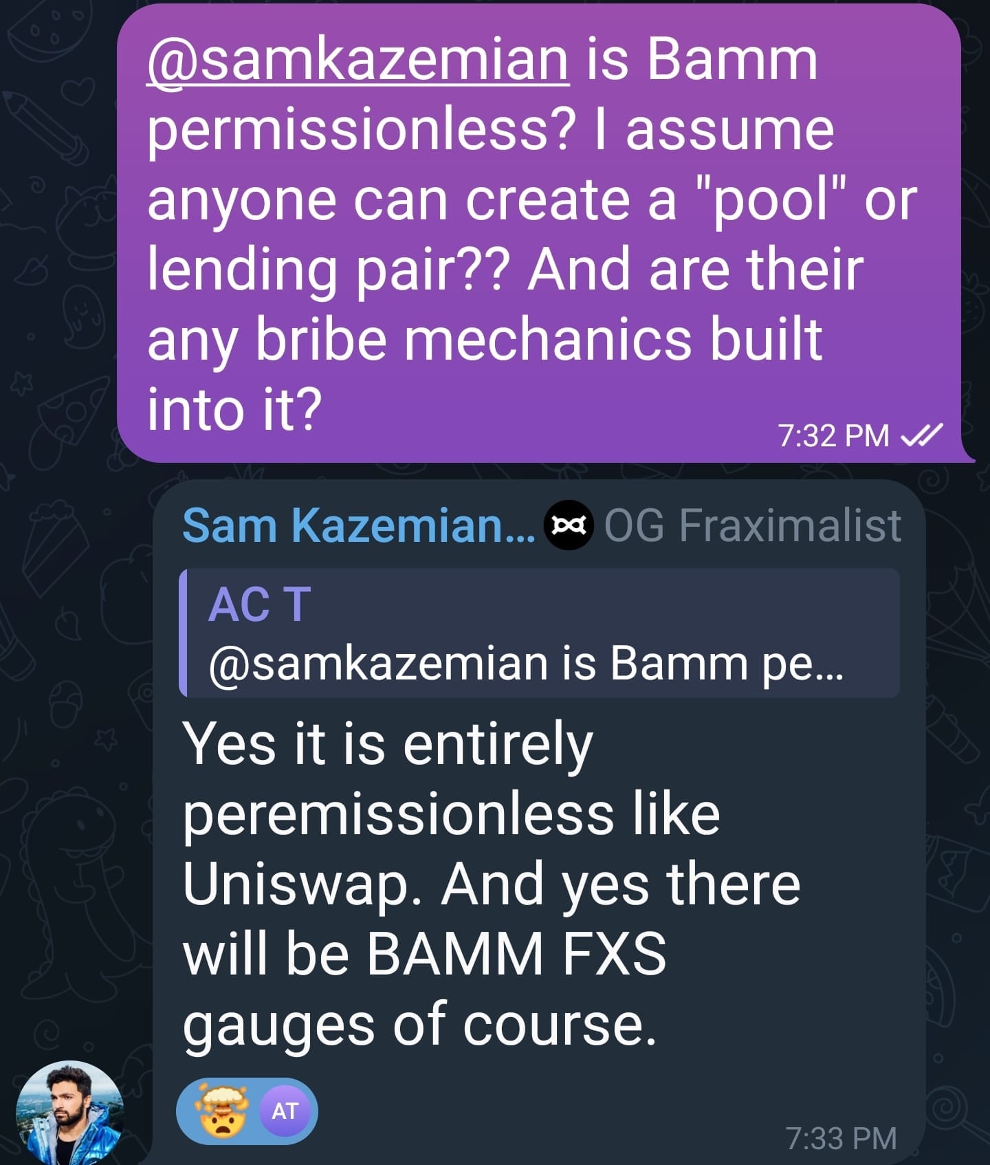 BAMM is completely permissionless, so any user can crate a lending pair just like they would on Uni V3. But unlike Uniswap, BAMM will have FXS guages so the pools can be bribed! Fees will be dynamic just like on Fraxlend!