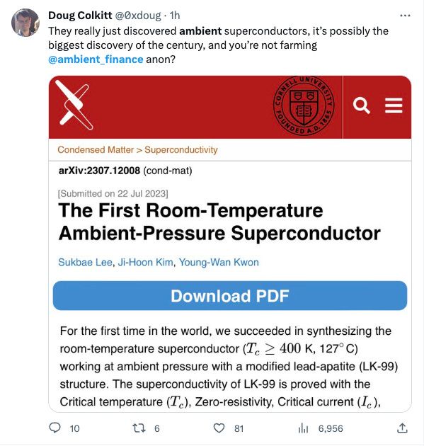 We don’t have much to say other than Ambient has yet to issue a token during this initial launch and test-in-prod period. While nothing explicit has been announced, Doug and the team have hinted at it. In a tweet published the same day as this article, Doug posted a screenshot of research into ambient superconductors and asked “and you’re not farming Ambient anon?”